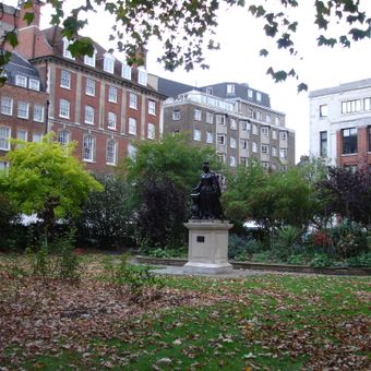 Queen Square is a garden square in Bloomsbury laid out with symmetrical paths, mature trees, and planted beds arranged around a central lawn. Georgian townhouses form a unified perimeter, creating an enclosed urban space that feels removed from the busy streets beyond.