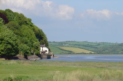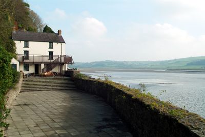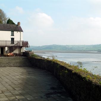 The Dylan Thomas Boathouse stands on a cliff above the Taf Estuary, featuring two floors, original furnishings, and panoramic views across the water.