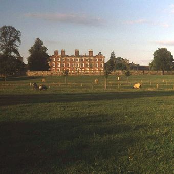 Weston Park is a red brick country house with stone detailing in Blymhill and Weston-under-Lizard near the Shropshire border, now serving as a museum. The main building rises three storeys in a U-shaped plan with eleven bays and sits within formal gardens surrounded by woodland and open parkland.
