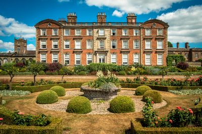 The Grade I listed Weston Park spreads across extensive grounds with red brick buildings, stone dressings, and formal gardens near the Shropshire border.