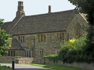 Abbey Farm House stands on Preston Road, constructed with traditional Ham stone featuring architectural elements characteristic of early 15th-century English agricultural buildings.