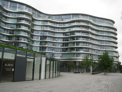 The Albion Riverside development features an asymmetrical crescent-shaped building with glass facades reflecting light conditions along the River Thames.