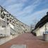 Three parallel concrete blocks stretch along railway tracks, with the tallest building forming an eight-story noise barrier shaped like a ziggurat.