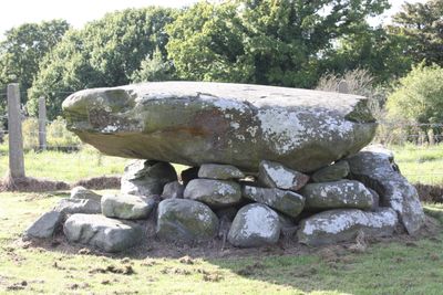 Archaeological investigations in 1802 revealed the dolmen was originally part of a 60-foot diameter cairn containing human remains and ashes within its chamber.