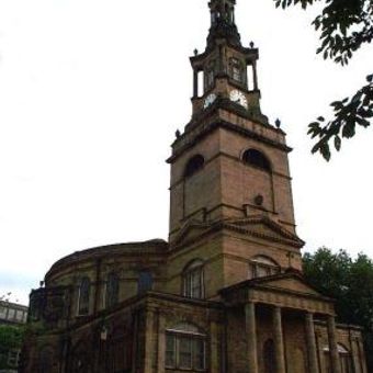 All Saints' Church is a Georgian-era religious building in Newcastle upon Tyne distinguished by its elliptical floor plan and twenty-seven windows that flood the interior with natural light. The nave ceiling features decorative plasterwork and the entire structure was built without internal supporting columns.