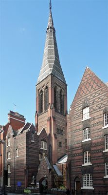 AllSaints,MargaretStreet,isanAnglicanchurchinLondon'sCityofWestminster,builtfrom redandblackbrickwithahightowerrisingaboveasmallentrancecourtyard.Thebuildingshowssmallirreg ularlyplacedwindowsandapointedarchgatewayaccessiblefromacrowdedurbanstreet.