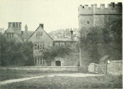 The stone manor house features a 15th-century embattled gate tower with multiple architectural elements from different construction periods.
