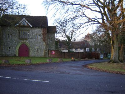 The Alton Abbey stands on Abbey Road in Hampshire, featuring architectural elements of flint and brick walls inspired by Tintern Abbey design.