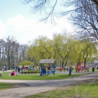 The park features a central boating lake surrounded by walking paths, trees, and benches for relaxation throughout different seasons.