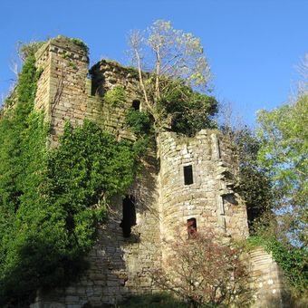The castle contains an underground pit prison and preserved fireplace, with remnants of multi-corbelled turrets that once extended above the main building.