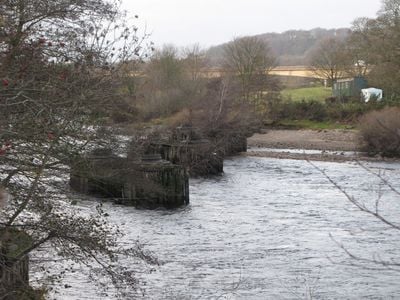 The Border Counties Bridge spans across the River Tyne with five sections supported by four stone piers that remain visible in the water.