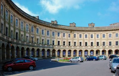 Buxton Crescent is a Georgian residential building with a curved southeast-facing facade that houses hotels, lodging accommodations, and an assembly room featuring a painted ceiling. The structure comprises interconnected sections that form a unified architectural complex in the town center.