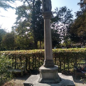 The Portland limestone memorial features a Gothic-style cross with carved figures of Saint Michael, Saint George, Victory, and Peace at its base.