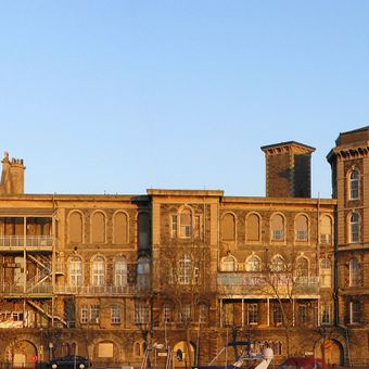 The Bristol General Hospital stands as a substantial Victorian structure on Guinea Street, featuring distinctive architectural elements and an ogee dome on the roof.