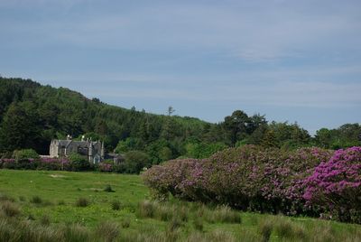 The estate includes traditional Scottish architectural details and maintains established gardens with rhododendrons, representing local building heritage.