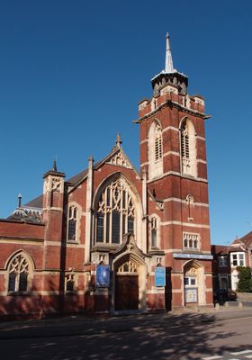 The Central Baptist Church stands with its ornate brick facade and arched windows, featuring elements of Gothic revival architecture along Devonshire Road.