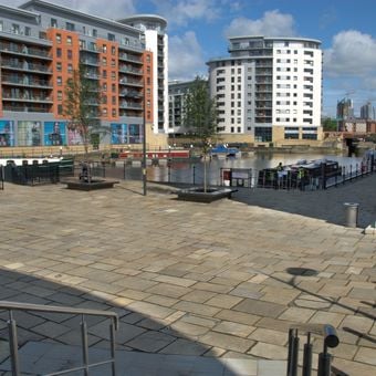 Leeds Dock is a waterfront development alongside the River Aire with residential areas, offices, restaurants, and leisure facilities spread across the site. The project blends historic dock structures with new buildings arranged around water and green spaces.