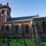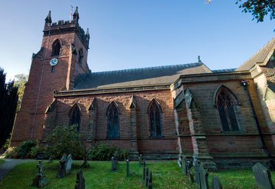 Christ Church features local red sandstone construction with a west tower, chancel, nave, and transepts added during later modifications.