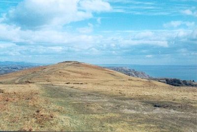 The 5-mile-long Old Red Sandstone ridge rises 188 meters above sea level, offering views across the Gower Peninsula and surrounding waters.