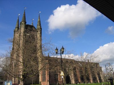 St Editha Church features medieval stained glass fragments, multiple stone arches, and a prominent tower that stands above the Tamworth townscape.