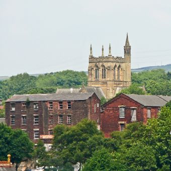 The Church of St Edmund stands on a diamond-shaped plot at the highest point in Rochdale, featuring intricate stone carvings and stained glass windows.