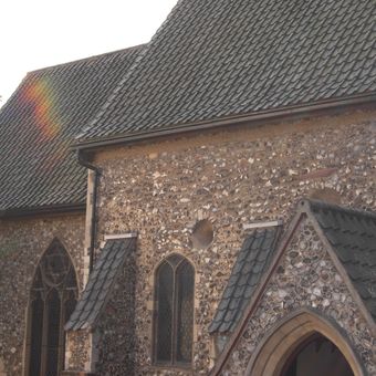 St Julian's Church is a medieval parish church in Norwich featuring flint and stone construction with a distinctive round tower. The interior displays a reconstructed nave and chancel that were rebuilt after significant World War II damage damaged the original structure.