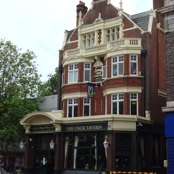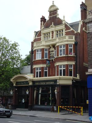 The Cock Tavern Theatre operated within a former pub building on Kilburn High Road, featuring an intimate 40-seat auditorium arranged in three rows that created close proximity between performers and audiences in a compact theatrical environment.