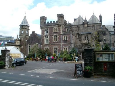 Craig-y-Nos Castle is a Scottish Baronial-style residence positioned on elevated grounds above the River Tawe, featuring distinctive towers and decorative gables throughout its design. The structure combines solid stone construction with ornamental architectural details and operates today as a hotel and event venue.