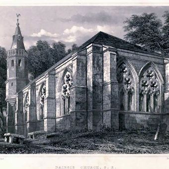Located 1.2 kilometers south of Dairsie village, this stone church features Gothic architectural elements with a distinctive piend roof and carved family crests.