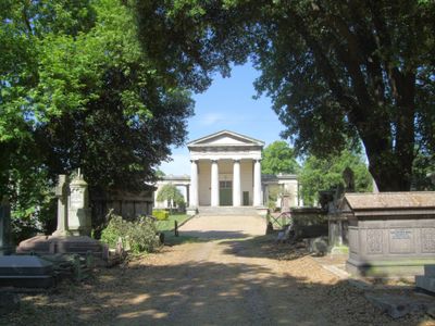 The Dissenters' Chapel features Portland stone construction with an Ionic tetrastyle portico and pediment within Kensal Green Cemetery's extensive grounds.