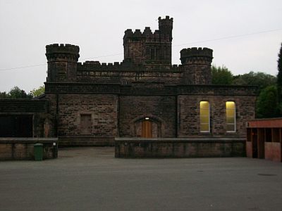 The castle features stone tympana with carvings depicting cotton industry scenes, including a representation of Richard Arkwright and manufacturing processes.