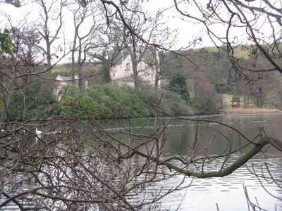 The L-shaped Couston Castle stands at the edge of Otterston Loch, featuring a north wing from the eighteenth century and restored sections from 1985.