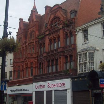 Corder House and Sydenham House display Neo-Moorish architecture with terracotta details, Gothic capitals, and elaborate decorative elements across their four-story structures.