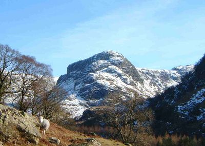 Eagle Crag rises 521 meters above Stonethwaite village, featuring steep rock walls and a characteristic tilted slab of rock at its peak.