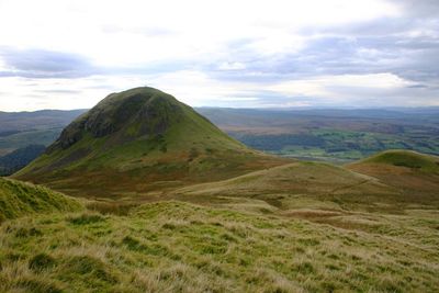 Dumgoyne rises 427 meters above the landscape as part of the Campsie Fells range, with its volcanic plug formation creating a notable silhouette against the sky.