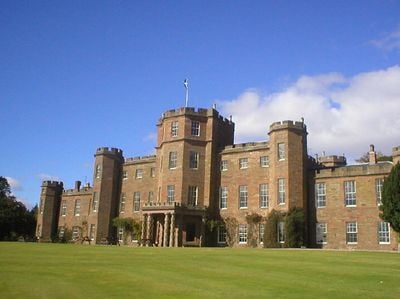 The mansion features a grand baronial architecture with extensive grounds spanning 400 acres of Scottish countryside near the village of Fettercairn.