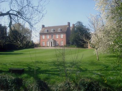 A red brick manor with two stories, cellars, attics, and a classical Doric porch constructed in the eighteenth century near Leominster.