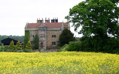 The Jacobean residence features two main floors with grand reception rooms, constructed using local stone and displaying symmetrical architectural elements on its exterior.