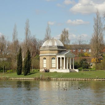 Garrick's Temple to Shakespeare is an octagonal brick building with an Ionic portico that stands on the north bank of the Thames within Garrick's Lawn gardens. The structure was designed to house a collection related to Shakespeare and remains one of the smallest listed buildings in the area.