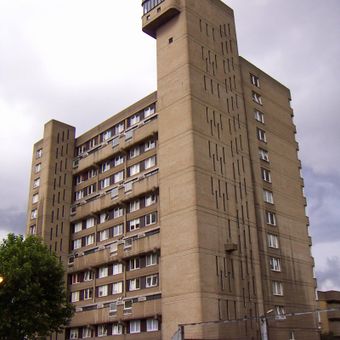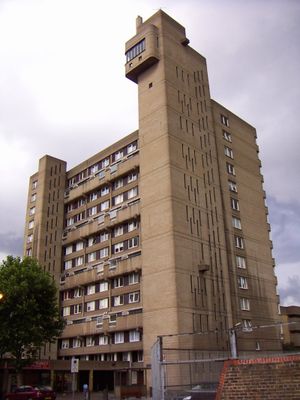 The building represents a prime example of British Brutalist architecture, incorporating Goldfinger's vision of social housing with spacious flats and large windows.