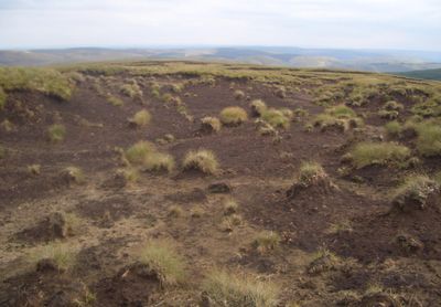 Gwaun Lydan rises to 632 meters above sea level, featuring a small boggy plateau marked by scattered stones at its highest point.