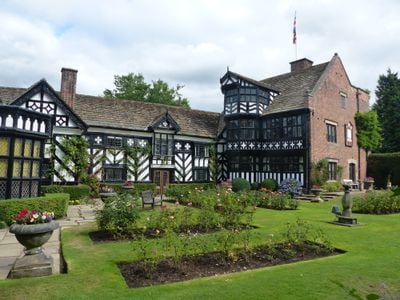 The black and white timber-framed Gawsworth Old Hall features a U-shaped design with two stories and sandstone roofing in Cheshire architectural style.