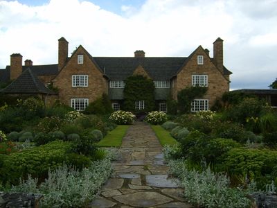 The Greywalls house features stone walls, Arts and Crafts architectural elements, and gardens overlooking the Firth of Forth in East Lothian.