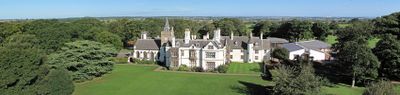 Grace Dieu Manor is a country house in Belton with Tudor architectural elements, stone walls, and large windows arranged in symmetrical design. The estate spans about 66 acres and contains a chapel, school buildings, and service structures on its grounds.