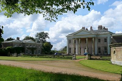 The grounds contain a circular pool enclosed by yew hedging and a South Lodge distinguished by its Doric portico architecture.