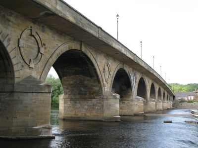 The stone bridge spans the River Tyne with nine segmental arches, connecting the town of Hexham to the North Tyne valley through its main thoroughfare.