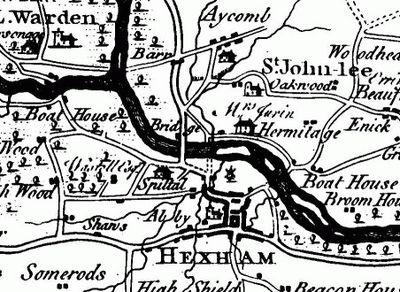 The bridge spans across the River Tyne with seven arches constructed from stone blocks, providing passage for travelers between Hexham and surrounding areas.