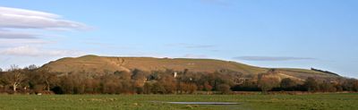 The chalk hill rises 190 meters above Blackmore Vale and River Stour, featuring multiple defensive banks and ditches covering 125,000 square meters.