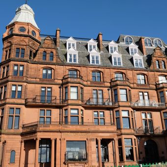 Hamilton Hall is a Category B listed hotel building in St Andrews with a red brick and red sandstone facade, standing directly behind the 18th green of the Old Course. It now contains 26 luxury apartments and sits adjacent to the Royal and Ancient Golf Club.