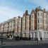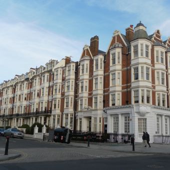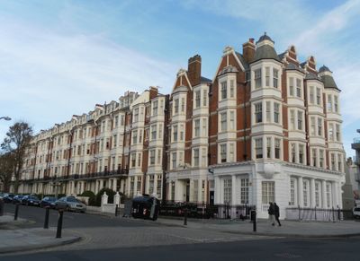 The red brick walls of Gwydyr Mansions rise four stories high with pale ashlar decorations and bay windows extending through each level.